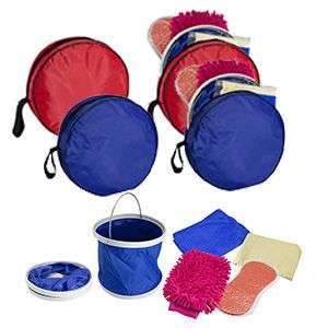 Kit de lavado de autos. Viene en un estuche de poliéster. Los accesorios son: Balde azul (plegable), paño limpia vidrios amarillo, toalla azul, esponja naranja (expandible), guantes de lavado. Se recomienda remojar en agua cada uno de los elementos de lavado antes de usar por primera vez.