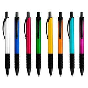 Bolígrafo con cuerpo de color metalizado opaco y terminales negros. Escritura azul.
