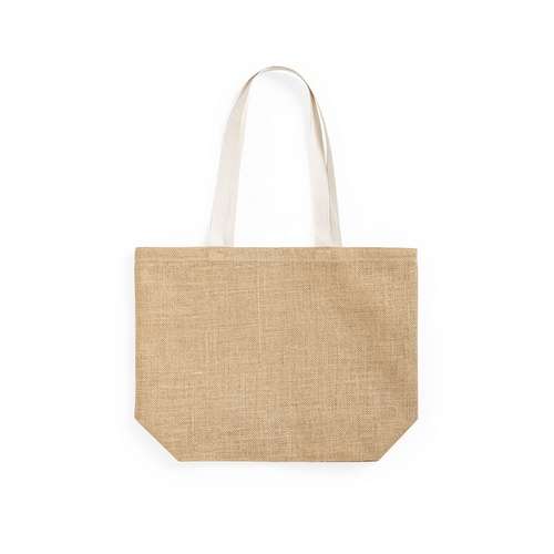 Bolsa de línea nature en resistente yute (250g/m2). Con asas de algodón largas en color natural y reforzadas. De acabado cosido, con fuelle en la base y resistencia hasta 8kg de peso.