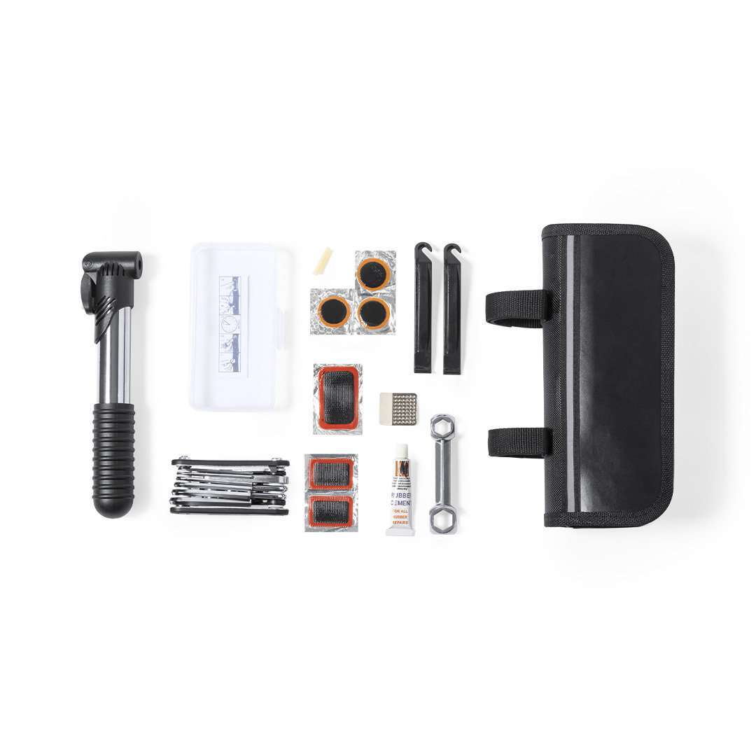 Completísimo kit de reparación para bici de 17 accesorios. Presentado en resistente estuche de poliéster 600D, con cierre de cremallera y cintas de fijación mediante velcro. Incluye desmontadores de cubierta, multiherramienta, llave fija, bomba manual de inflado con doble válvula, kit de reparación de pinchazos y manual de instrucciones. 16 Accesorios