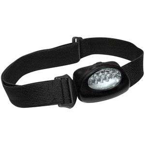 Linterna para cabeza con 5 luces LED blancas, switch de 3 funciones secuenciales y cintillo elástico negro ajustable.