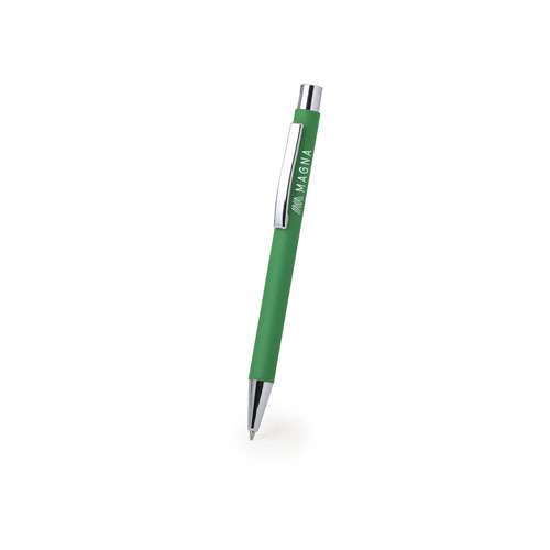Original bolígrafo de mecanismo pulsador en elegante diseño bicolor. Con cuerpo de aluminio en tacto goma de acabado mate. Especialmente diseñado para marcaje en láser y mostrar el logotipo en tono plateado. Clip, parte superior y punta en plateado. Disponible en variada gama de colores, con cartucho jumbo y tinta azul. Carga Jumbo