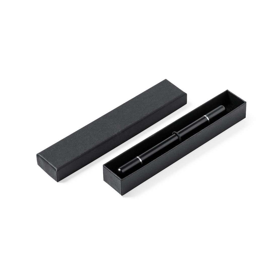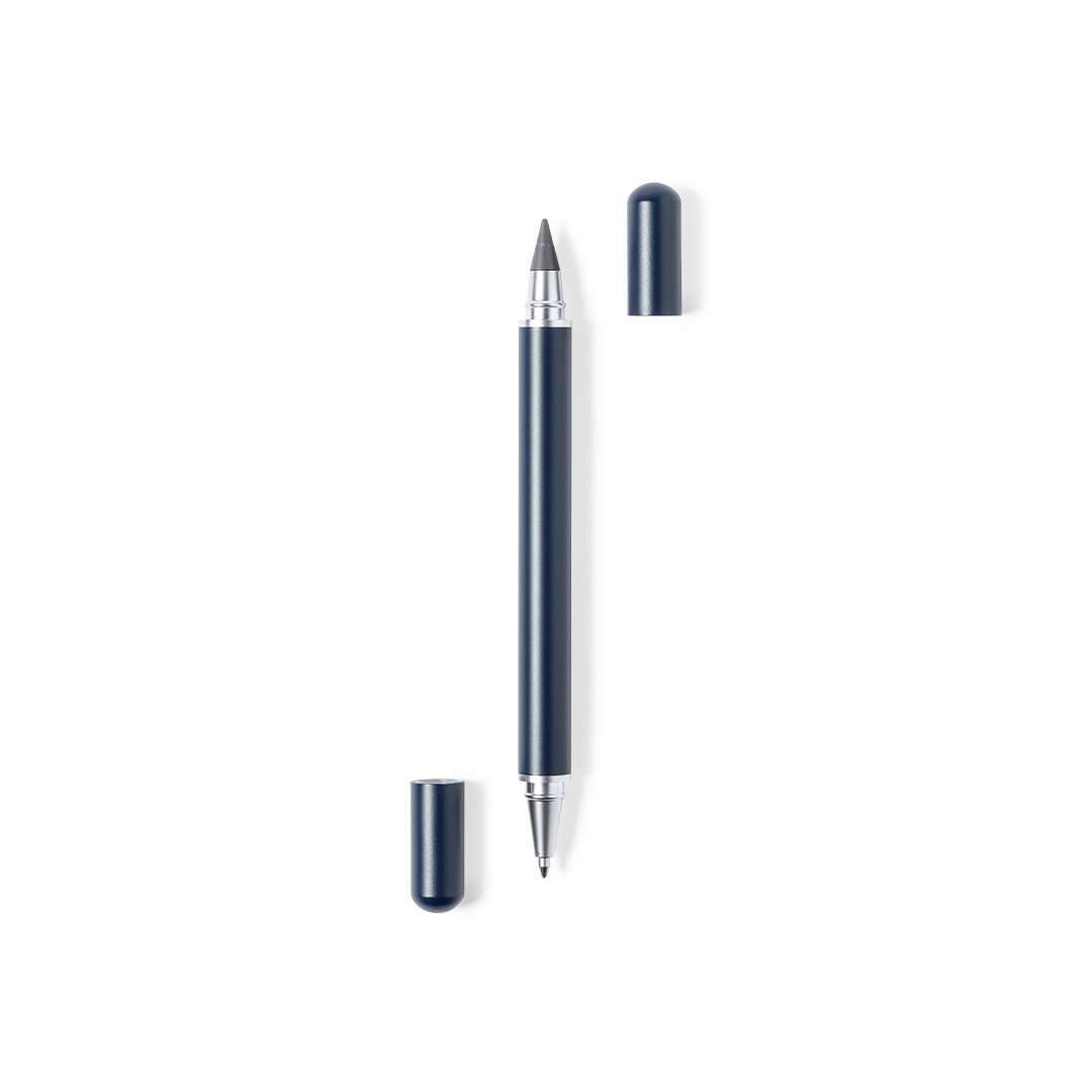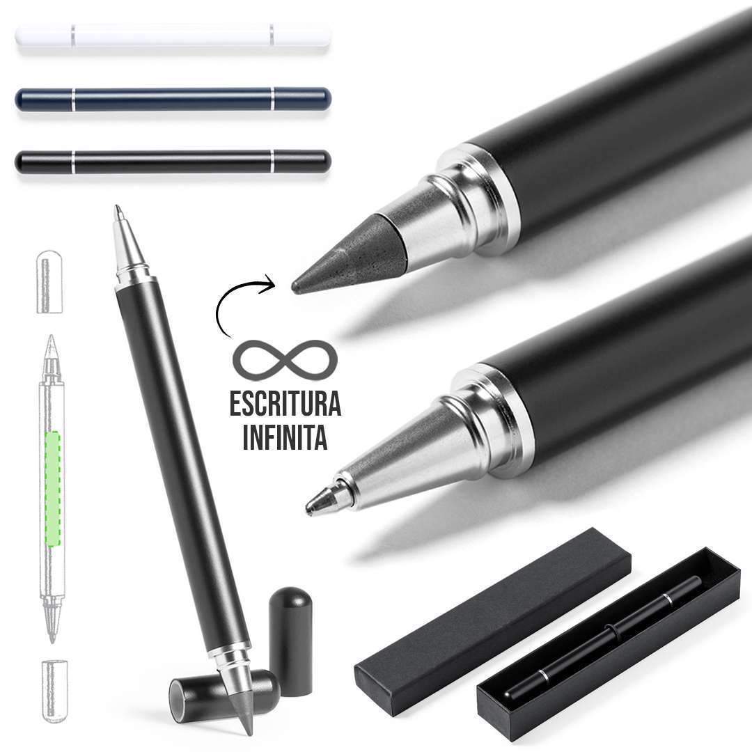 Bolígrafo lápiz eterno 2 en 1, fabricado en resistente metal de acabado brillo. Con cierre de capucha, incluye bolígrafo en un extremo (carga jumbo y tinta azul), y lápiz eterno en el otro extremo, para así usar siempre el mismo lápiz y no generar residuos. Presentado en estuche individual negro. Carga Jumbo