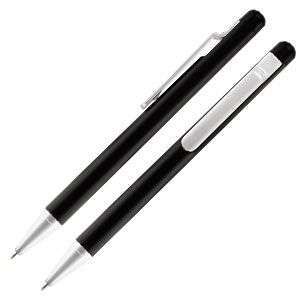 Bolígrafo plástico negro con terminales plata. Escritura Azul.