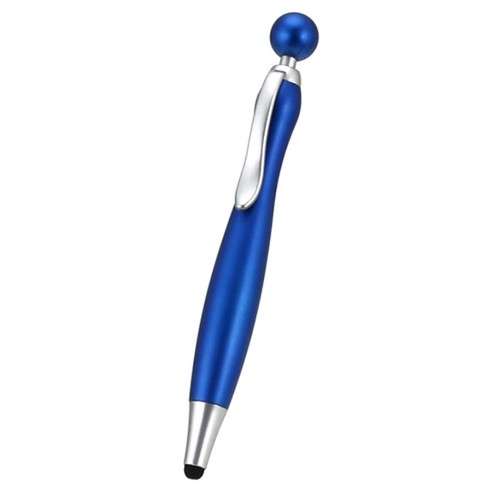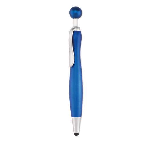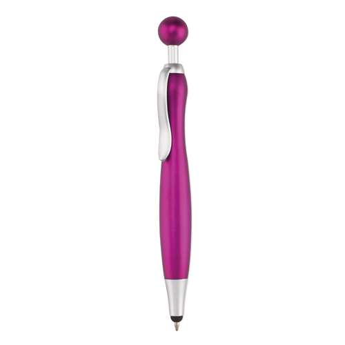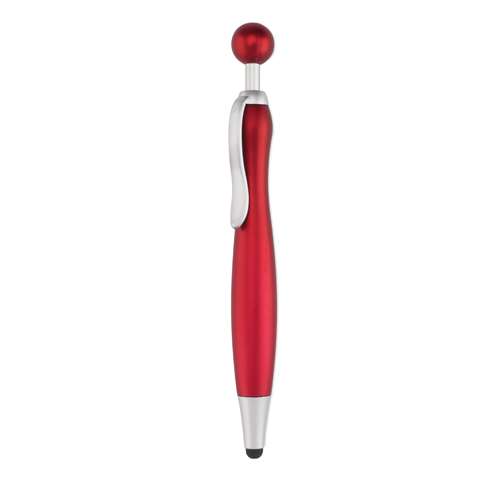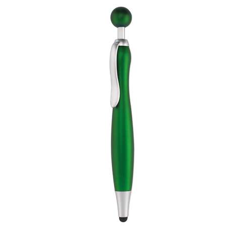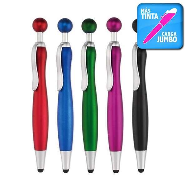 Bolígrafo puntero de mecanismo pulsador de atrevido diseño bicolor con accesorios en plateado metalizado y cuerpo curvado de suave acabado metalizado en llamativos colores sólidos. Con original clip pulsador en forma de bola a juego. De cartucho jumbo y tinta azul. Carga Jumbo
