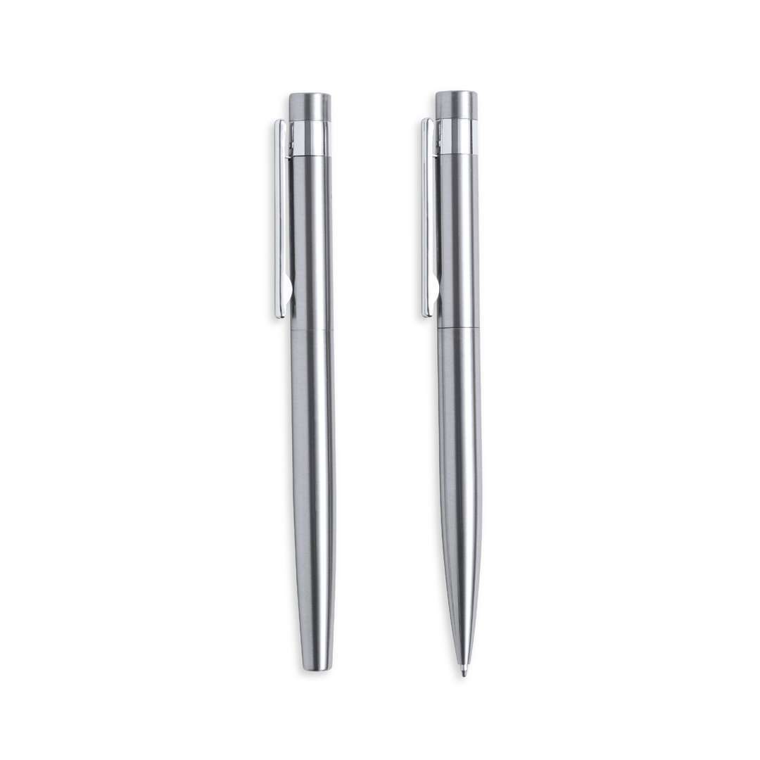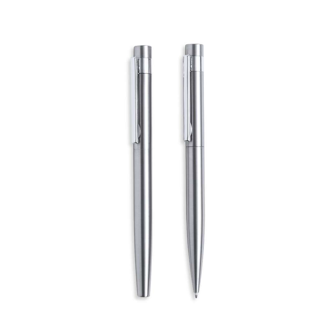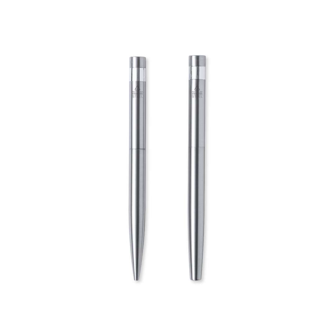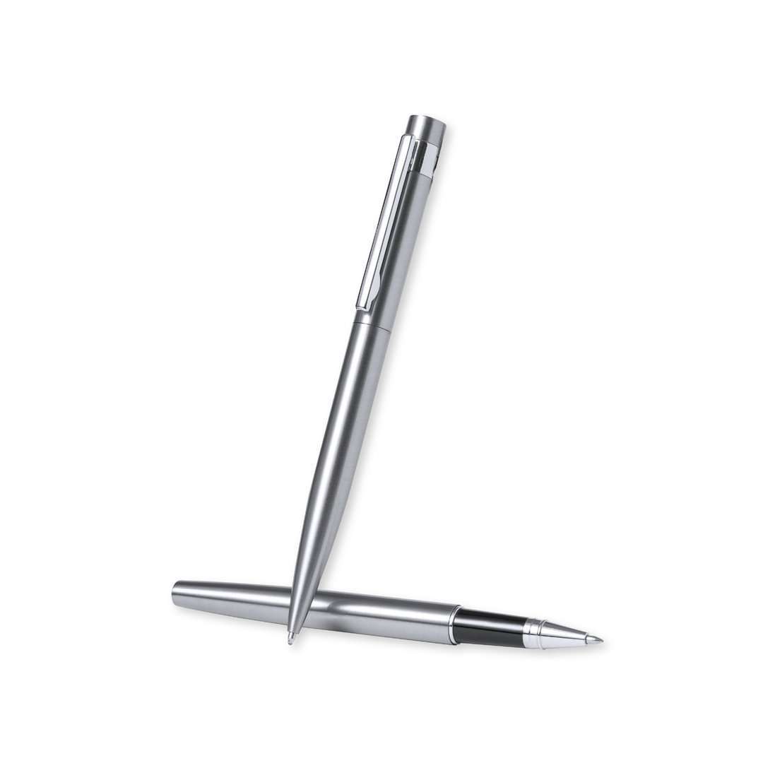 Set eco-friendly de bolígrafo y roller, fabricados en acero inox reciclado. Incluye: Bolígrafo de mecanismo giratorio, con cuerpo en acabado plateado y accesorios en cromado. Clip metálico y distintivo acero inox reciclado en la parte superior del bolígrafo. Cartucho jumbo y tinta azul. Roller con cuerpo en color plateado y accesorios en cromado. Clip metálico…