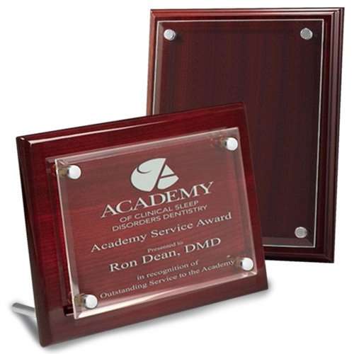 Galvano madera frontis acrílico con 4 distanciadores duraluminio y pedestal metálico para presentación de escritorio.
