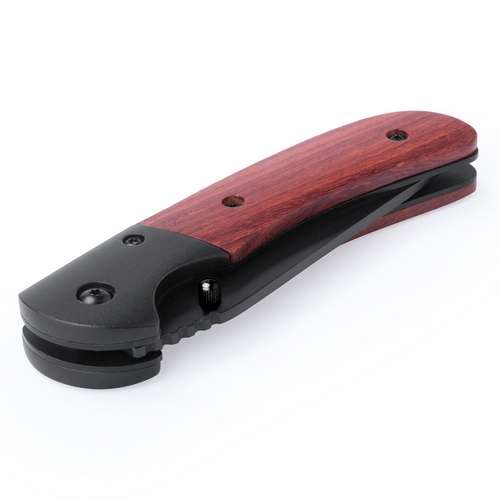 Navaja de alta calidad con hoja en acero inox de color negro y empuñadura en madera natural con bloqueo de seguridad. Presentada en caja individual. Con Bloqueo