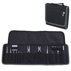 Set de 26 prácticas herramientas en Estuche plegable de tela raquelada negra.