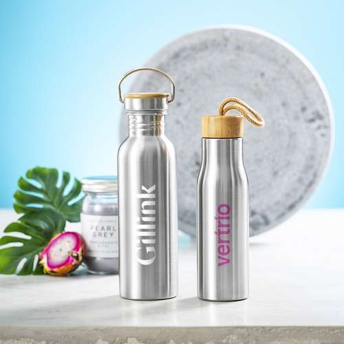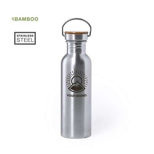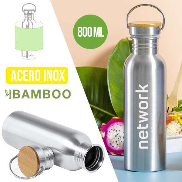Bidón de línea nature y 800ml de capacidad. Cuerpo fabricado en acero inox y tapón en bambú con original asa metálica de transporte. Presentado en atractiva caja de diseño eco. 800 ml. Presentación Individual