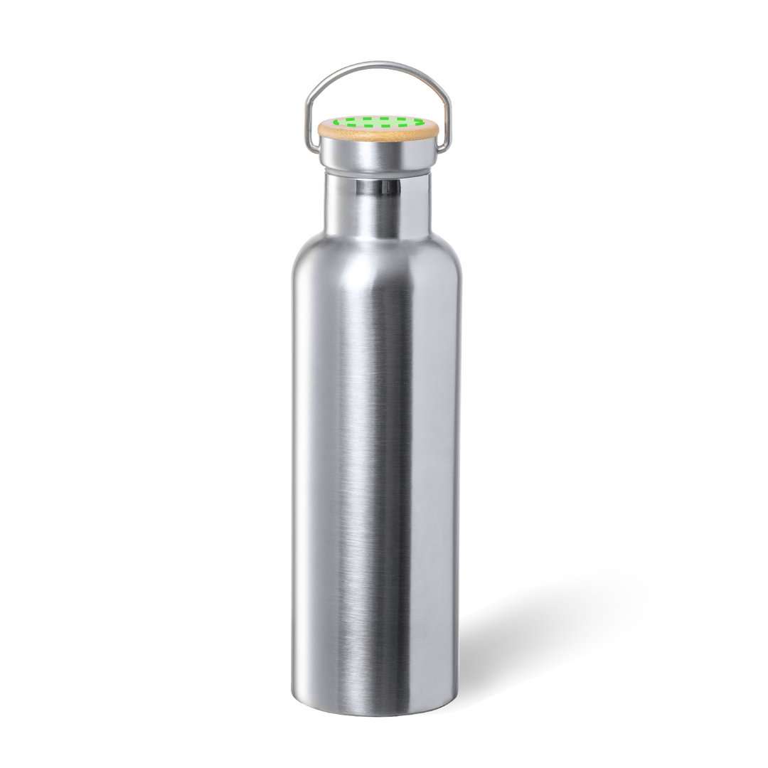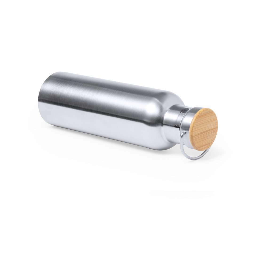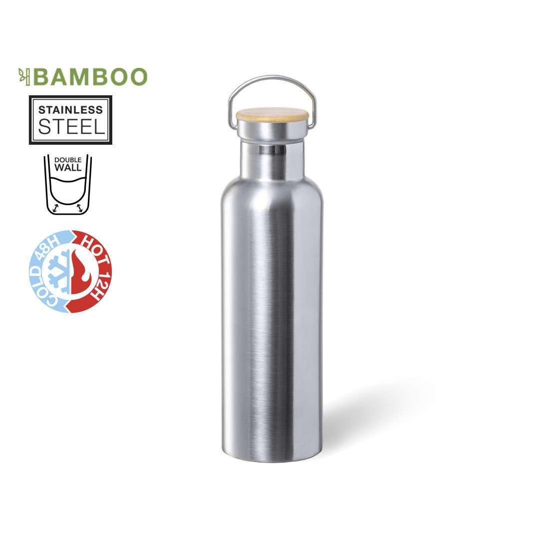 Bidón térmico de 750 ml de capacidad, fabricado en acero inox de doble pared y acabado mate. Incluye original tapón a rosca en acero inox, con detalle de bambú y asa integrada. Libre de BPA y presentado en caja individual de diseño kraft. 750 ml