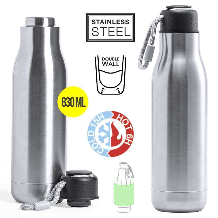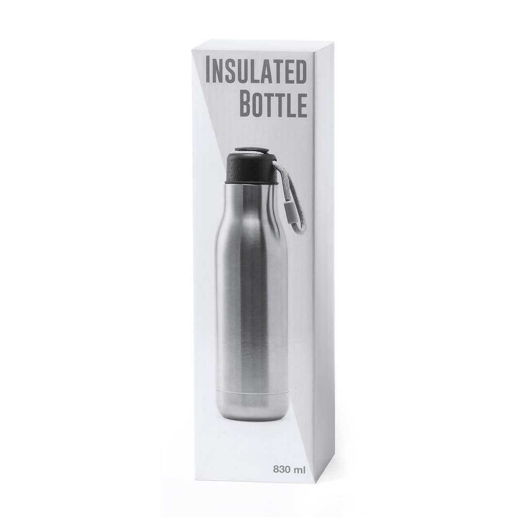 Bidón térmico de acero inox y doble pared de 830ml de capacidad y de acabado brillo. Tapón de seguridad libre de BPA y presentado en atractiva caja de diseño. 830 ml