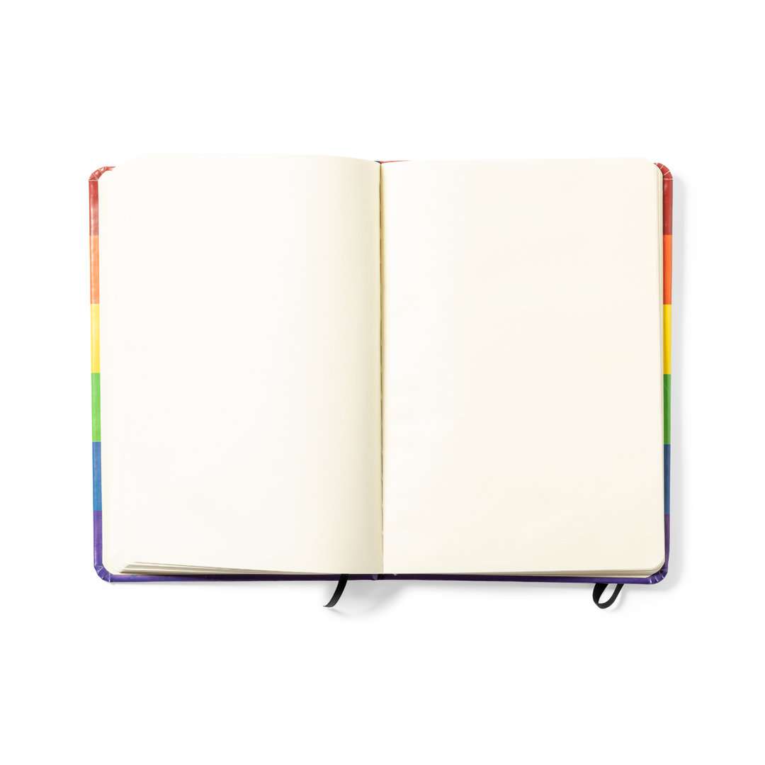 Bloc de notas Rainbow multicolor, con tapas duras en polipiel de suave tacto y elástico de sujeción. Todo un orgullo de bloc de notas, con 100 hojas interiores lisas y marcapáginas de tela. Portada Rígida. 100 Hojas