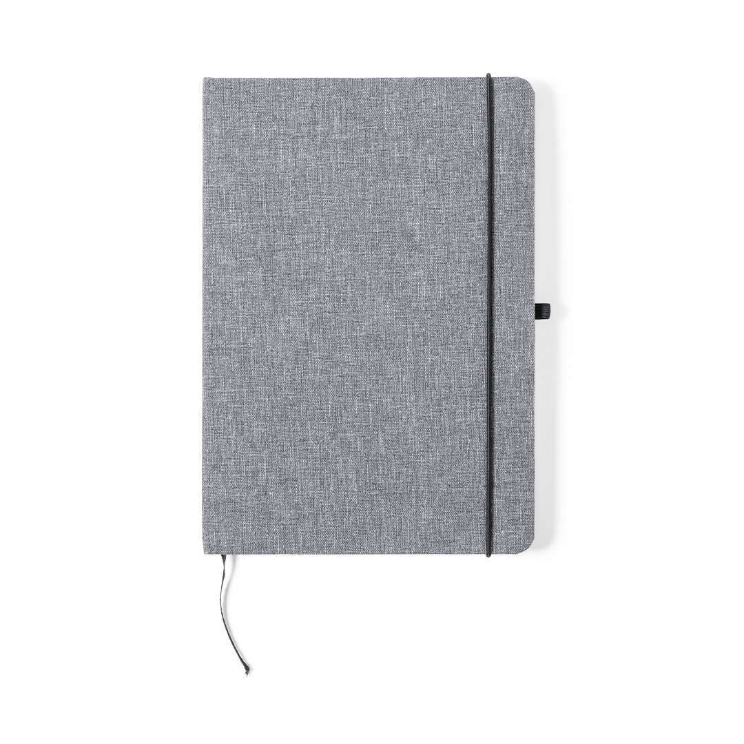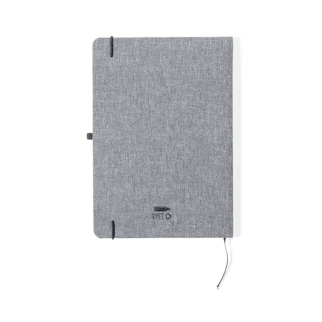 Bloc de notas de línea nature. Con tapas rígidas fabricadas en RPET, elaborado a partir de plástico reciclado, para así fomentar la reutilización de residuos plásticos y ayudar a la sostenibilidad del planeta. Interior con 100 hojas de disposición a una raya. Incluye marcapáginas, elástico de cierre y soporte para bolígrafo a juego. incluye distintivo…