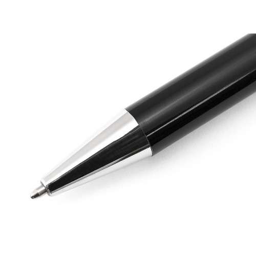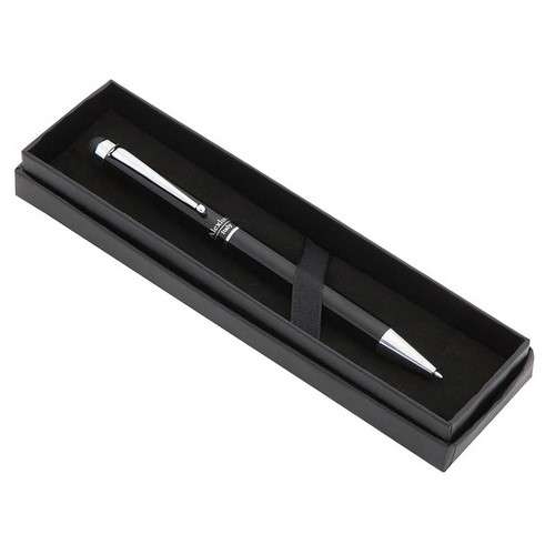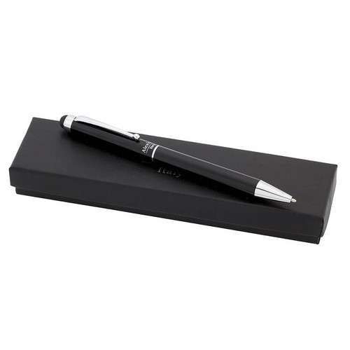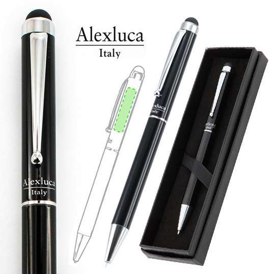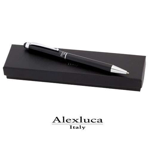 Bolígrafo puntero de Alexluca de mecanismo giratorio con suave cuerpo metálico de elegante color negro. Clip y punta de diseño a juego. Presentado en estuche individual negro con logotipo de la marca. Tinta azul.