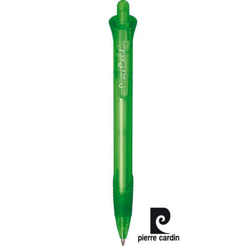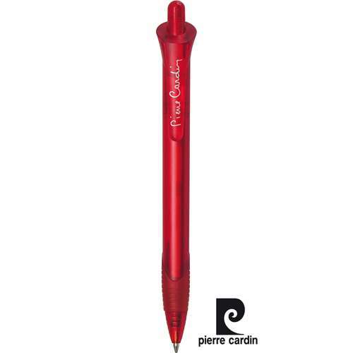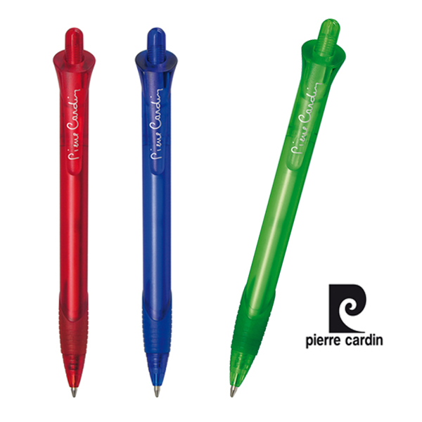Bolígrafo de Pierre Cardin de mecanismo pulsador de original diseño y suave cuerpo de acabado translúcido en vivos colores. Con accesorios a juego y logotipo de la marca en el clip. Cómoda empuñadura de goma, de cartucho jumbo y tinta azul. Carga Jumbo