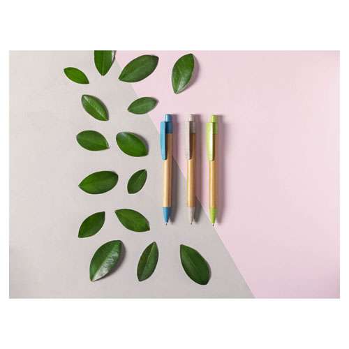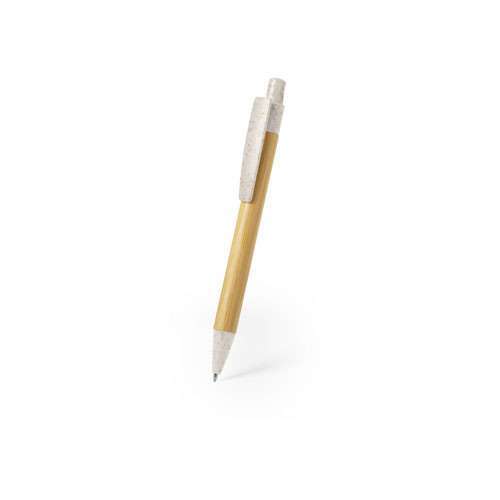 Bolígrafo con mecanismo pulsador de línea nature. Cuerpo en bambú, con accesorios a juego en caña de trigo, para así fomentar la utilización de materias primas naturales y reducir las emisiones contaminantes. Original clip tamaño XL y disponible en variada gama de colores y en tinta azul.