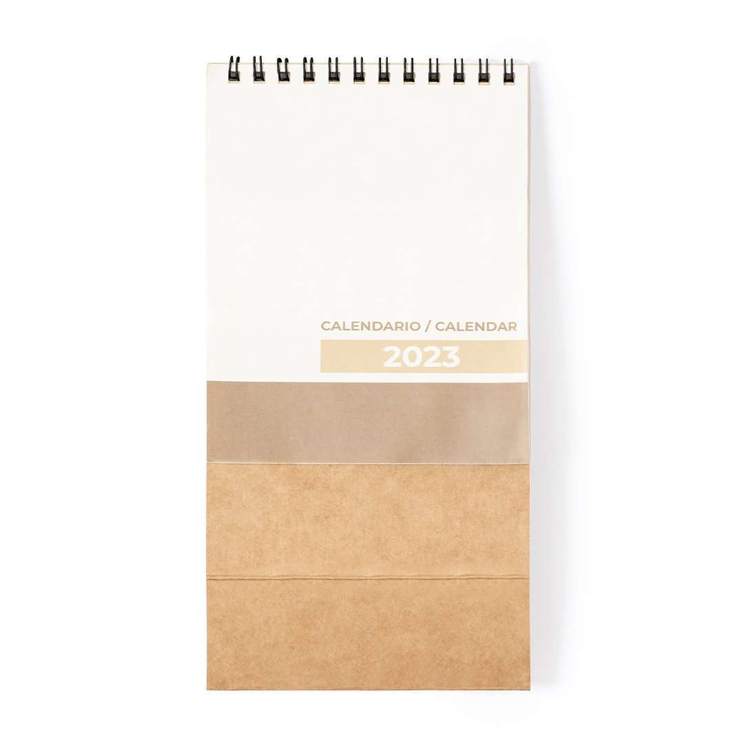 Calendario de sobremesa de línea nature. Fabricado en cartón reciclado, con anillas en color negro. Diseño mes en curso/ mes anterior/ mes siguiente. Amplia superficie de marcaje en ambas caras.