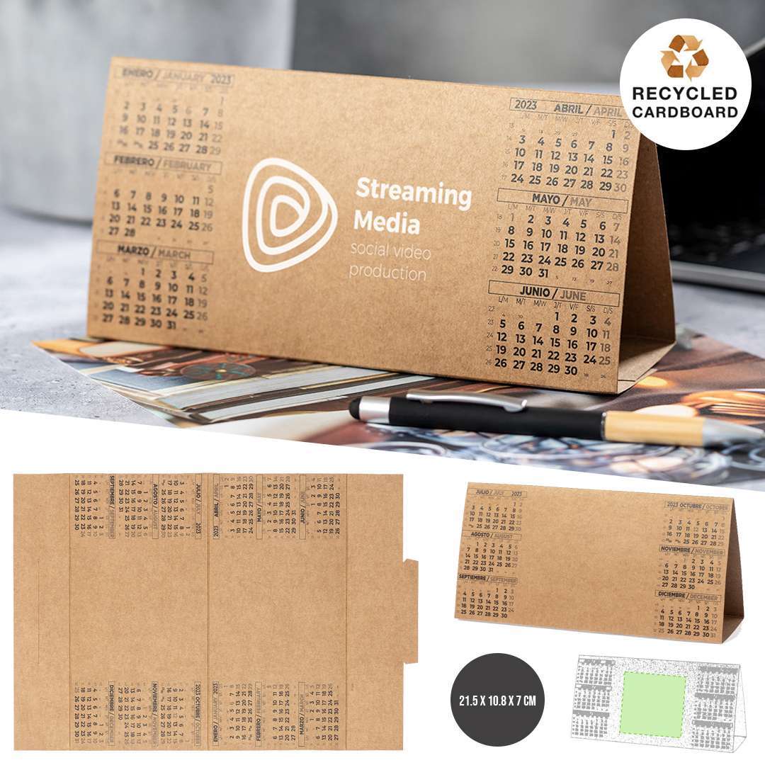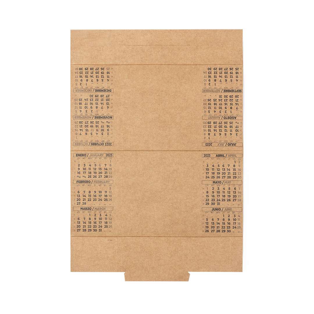 Calendario de sobremesa de línea nature. Fabricado en cartón reciclado, de fácil montaje y con amplia superficie de marcaje en ambas caras.