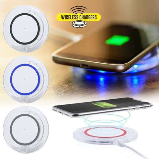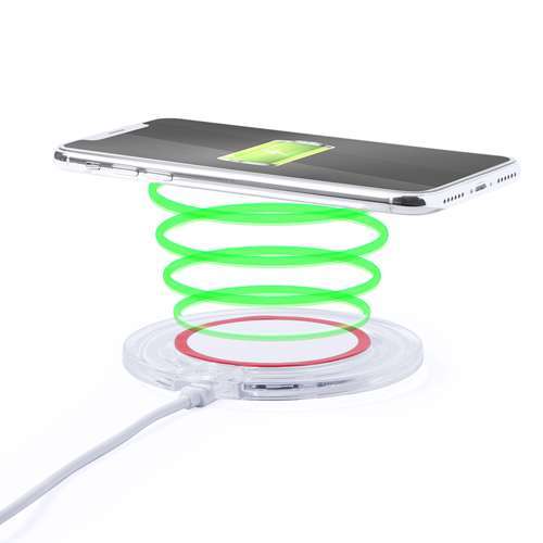 Cargador inalámbrico circular. Cuerpo transparente con detalle en variada gama de vivos colores. Con base antideslizante e indicador led de estado de carga. Compatible con dispositivos equipados con tecnología de carga inalámbrica y presentado en atractiva caja de diseño. Inalámbrico. Cable Incluido