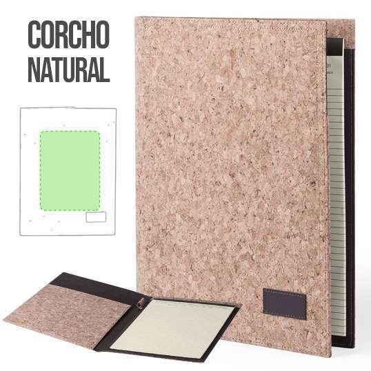 Carpeta con tapas de suave tacto acabadas en corcho natural y con interior en suave polipiel. Con bolsillo interior acabado en corcho, bloc de notas con 20 hojas de distribución a una raya y soporte para bolígrafo. Bloc 20 Hojas