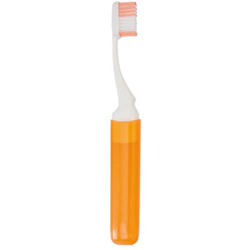 Cepillo de dientes plegable de suave tacto y llamativo diseño bicolor en amplia gama de colores.