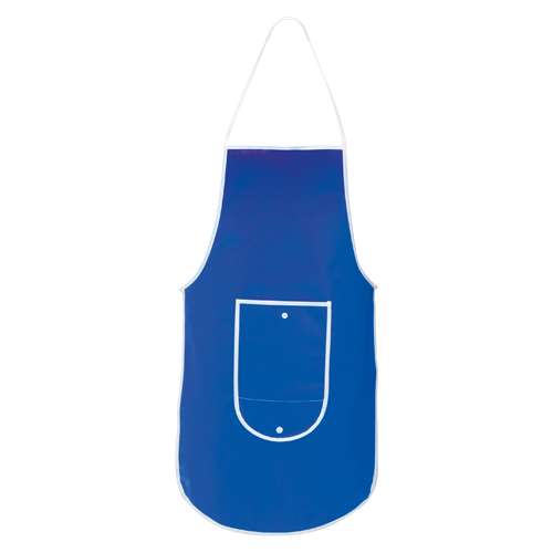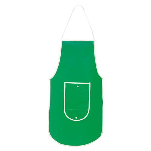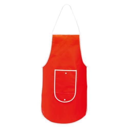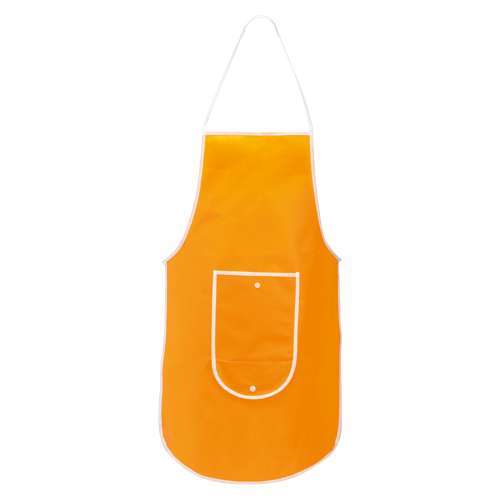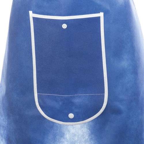 Delantal plegable de non-woven en variada gama de vivos colores. Con bolsillo frontal, cintas de ajuste y ribetes en color blanco. Plegado de pequeño tamaño con cierre de corchete y de corte por encima de la rodilla.