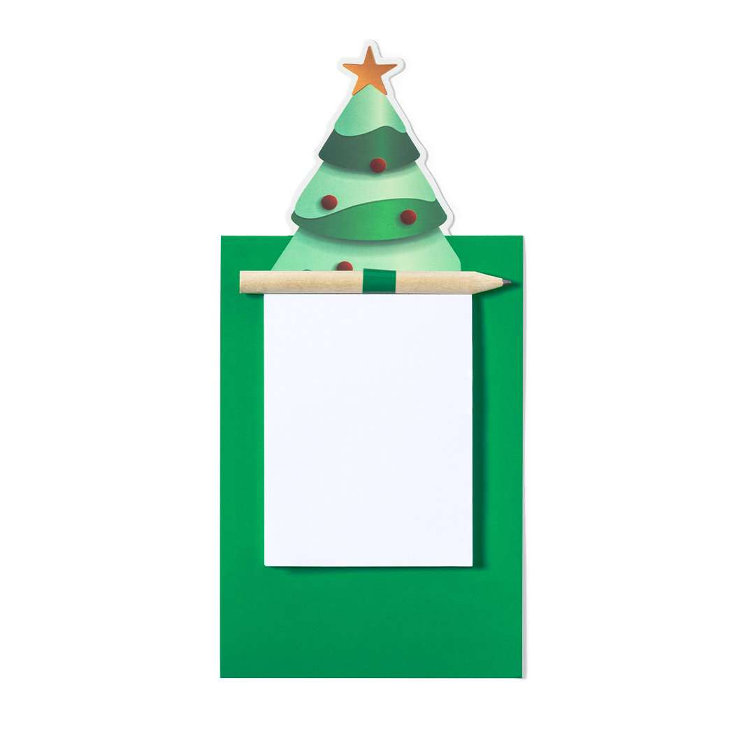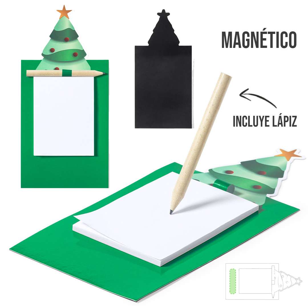 Imán con bloc de notas en divertido diseño de árbol navideño. Incluye 40 hojas lisas y lápiz de madera natural. Bloc 40 Hojas. Lápiz Incluido