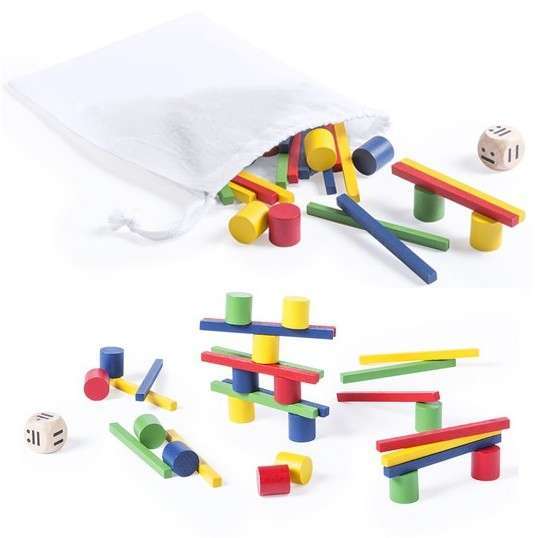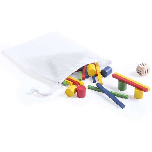 Juego de habilidad con 33 piezas de madera pintada en vivos colores. Con dado y presentado en funda de tela con cordones auto cierre. 33 Piezas