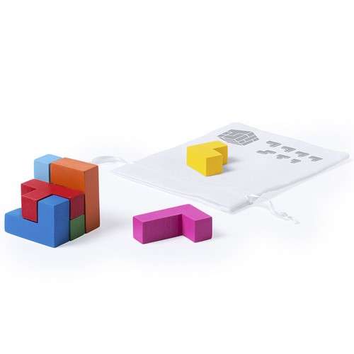 Juego de habilidad 3D en madera con piezas de vivos colores. Presentado en funda individual de poliéster para fácil marcaje. 7 Piezas