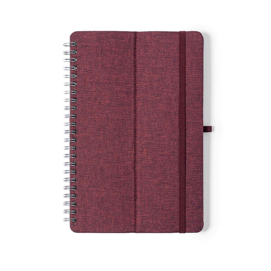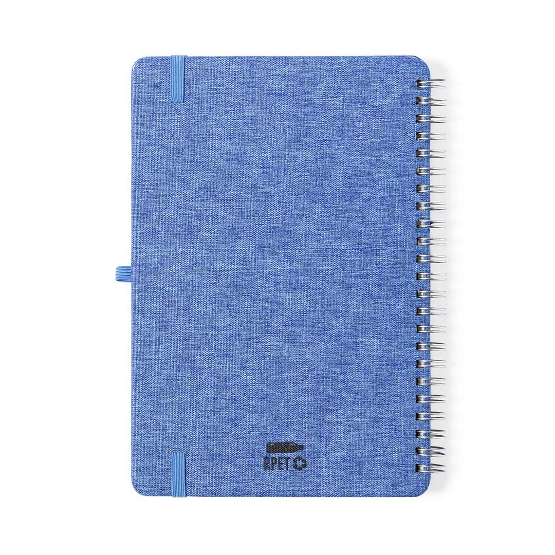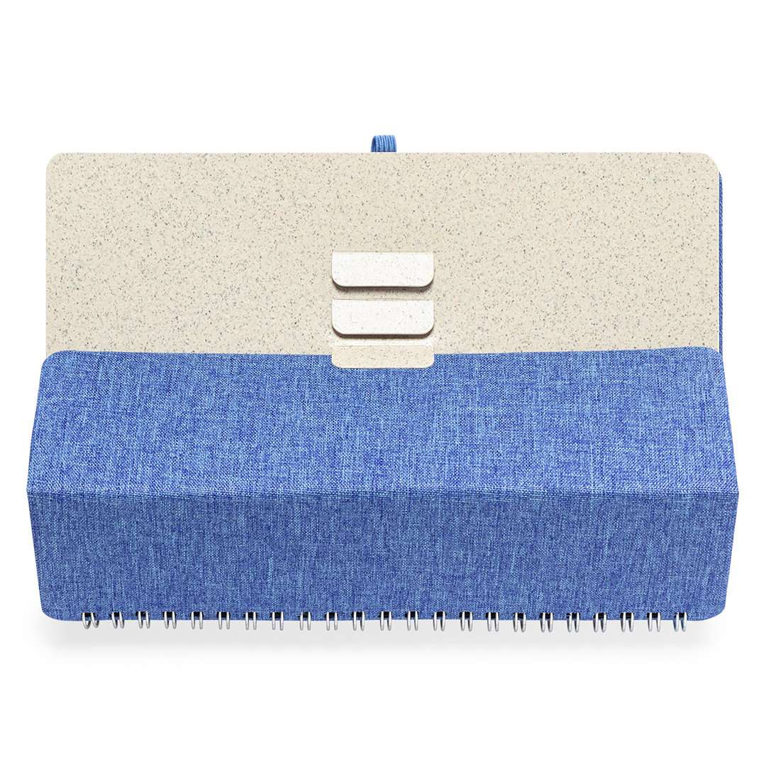 Libreta soporte de anillas de línea nature. Tapas rígidas fabricadas en resistente material RPET 300D, elaborado a partir de plástico reciclado. Con original soporte para smartphone y tablet integrado en la portada y fabricado en caña de trigo. Incluye elástico de cierre y soporte para bolígrafo a juego. 70 hojas interiores con disposición a una…
