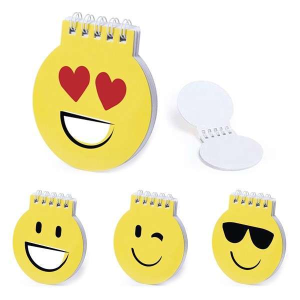 Libreta de divertidos diseños emoji en llamativo color amarillo. De anillas blancas, con tapas de cartón rígidas de suave acabado brillante y 40 hojas lisas. Portada Rígida. 40 Hojas
