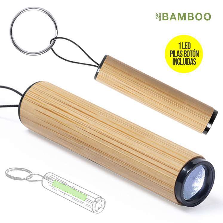 Llavero linterna de línea nature, fabricado en bambú. 1 led, con alimentación a pilas de botón (incluidas) y presentado en bolsita de diseño individual. 1 Led. Pilas Botón Incluidas