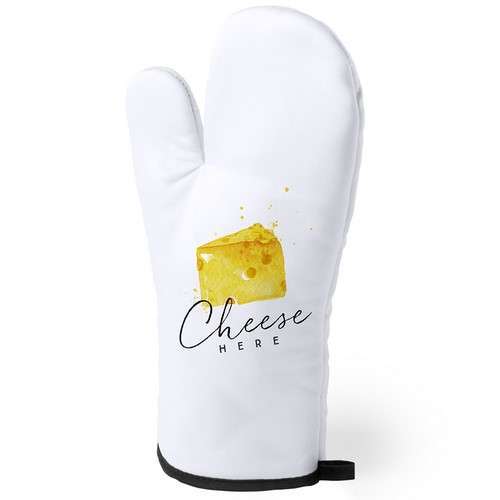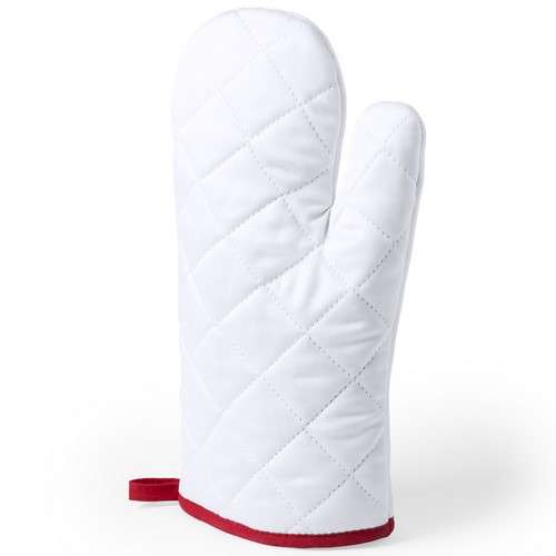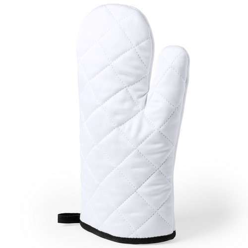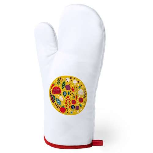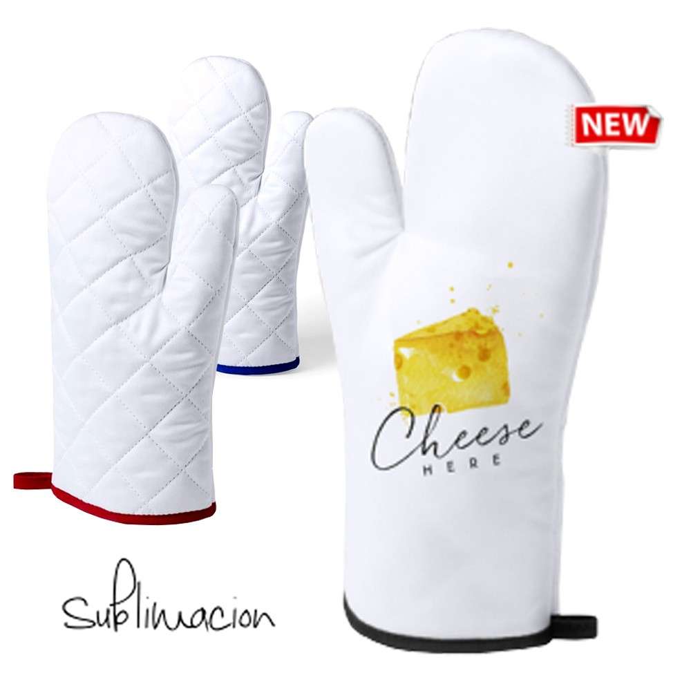 Manopla de cocina en suave material 100% poliéster de suave acabado en color blanco y con bordes en vivos colores. Con una cara lisa especialmente diseñada para sublimación y cinta para colgar. Una Cara Lisa para Impresión