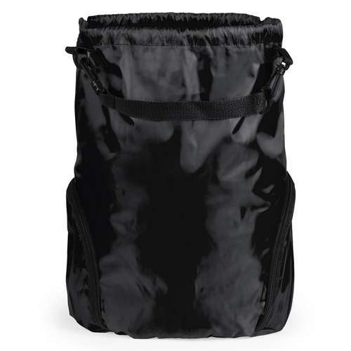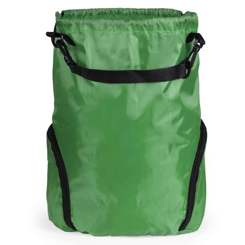 Versátil mochila de cuerdas en poliéster 210D en atractivo diseño bicolor. Con 3 bolsillos exteriores de cremallera y accesorio en cierre para acople de asa de transporte con cierres de mosquetón. Cuerdas autocierre en color negro y esquinas con argollas metálicas reforzadas.