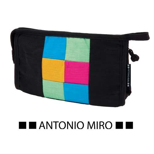 Neceser multiusos de Antonio Miró en combinación de materiales microfibra y nylon. Con original diseño multicolor, cierre de cremallera y asa de transporte. Logotipo de la marca en etiqueta exterior. Con Forro Interior