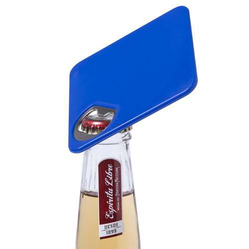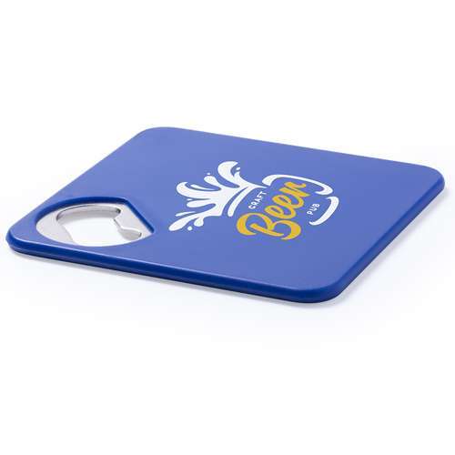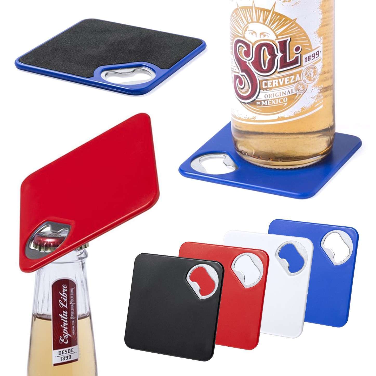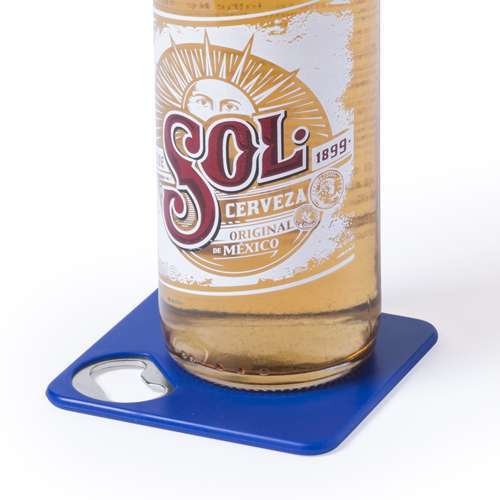 Original posavasos con abridor metálico integrado en variada gama de vivos colores. Con superficie anti deslizante en la base.