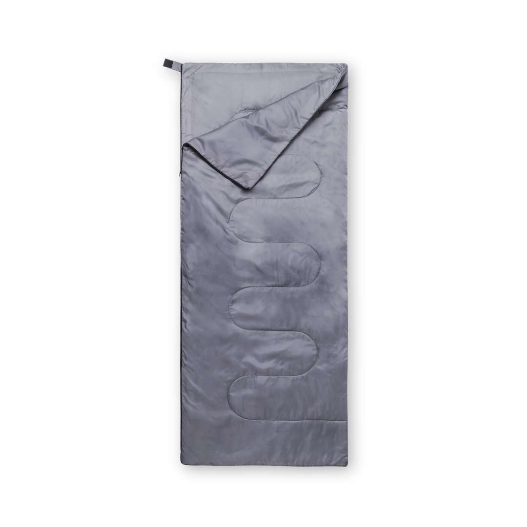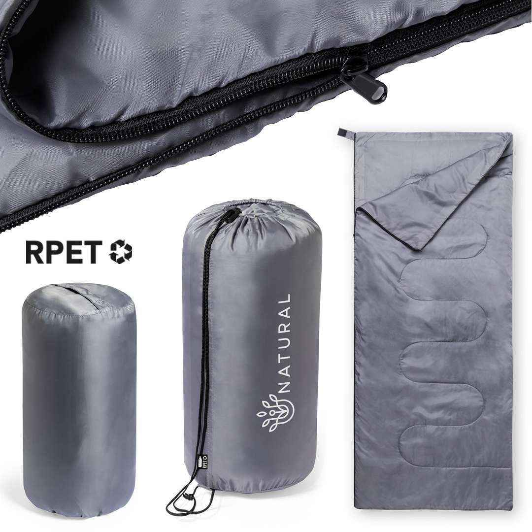 Saco de dormir fabricado en resistente poliéster RPET 190T de agradable y cálido tacto, en color gris. Con grueso acolchado interior y cierre de cremallera de apertura total; con doble tirador interior y exterior. Funda a juego en RPET, con cierre de cordón, ajustador y etiqueta exterior con distintivo RPET. El material RPET se elabora…