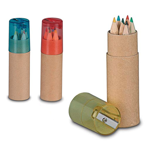 Set de 7 piezas en estuche con cuerpo en cartón natural y capucha transparente en variados colores. Incluye 6 lápices de madera con cuerpo hexagonal de acabado natural y sacapuntas integrado en tapadera. 7 Piezas