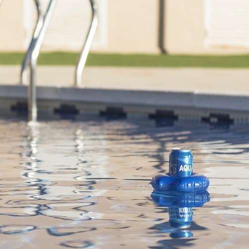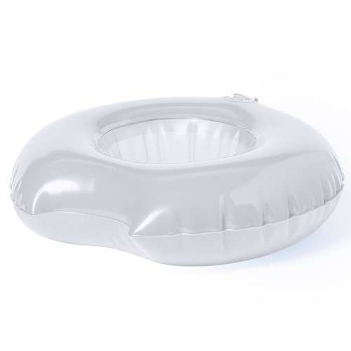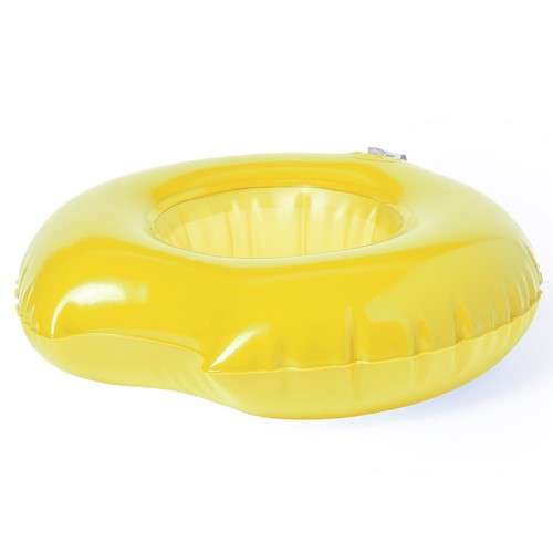 Original soporte inflable para bebida en forma de donut mordido. Con suave cuerpo acabado en PVC de vivos colores y presentado con plegado especial para impresión. Plegado Especial para Impresión