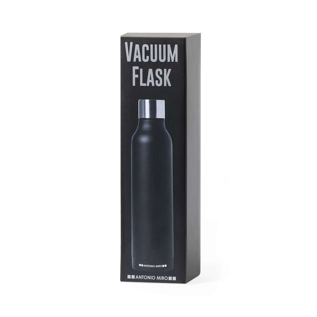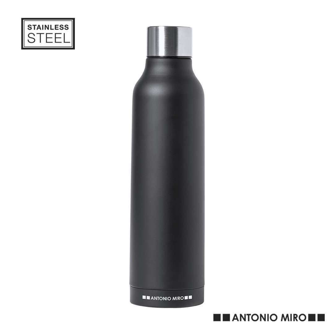 Termo en acero inox de Antonio Miró. De 500ml de capacidad y con doble pared para mejor y más duradera conservación de la temperatura. De sobrio acabado en negro satinado, logotipo de la marca en la base y con tapón cromado a rosca. Presentado en atractiva caja de diseño con logotipo de la marca. 500…