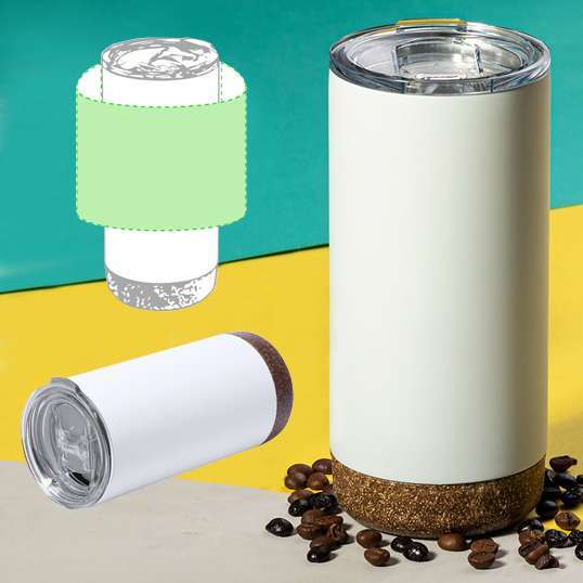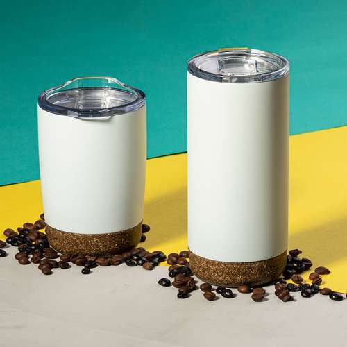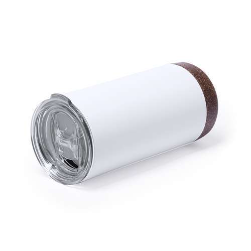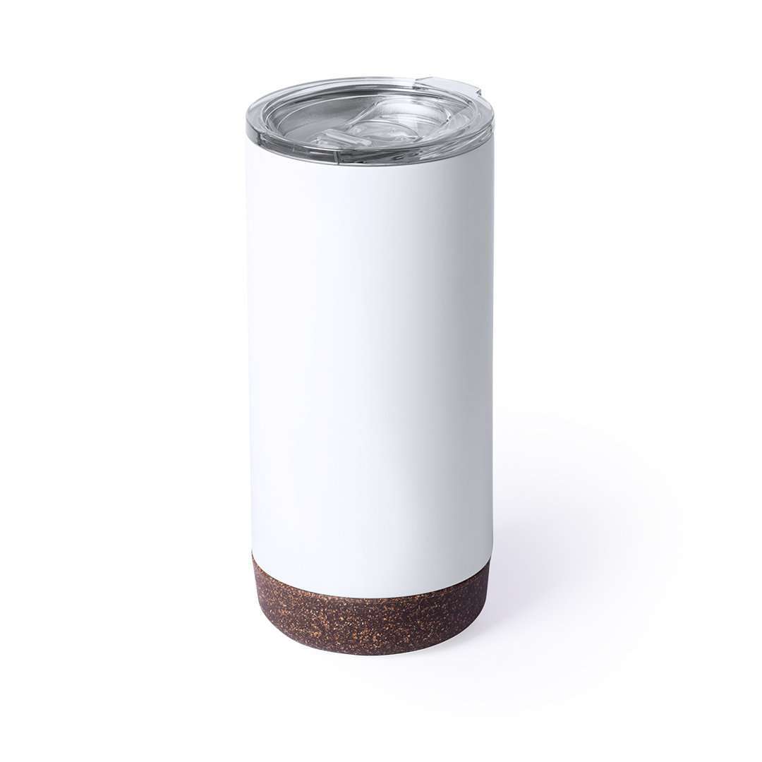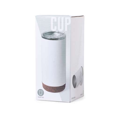 Vaso en 500 ml de capacidad, de línea nature en combinación de base en corcho natural con cuerpo en acero inox de acabado blanco. Con doble cobertura para mejor y mas duradera conservación de la temperatura y original tapón dosificador transparente. Presentado en atractiva caja de diseño. 500 ml. Presentación Individual