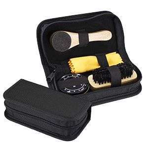 Kit limpieza de calzado. Viene en estuche negro (acabado barniz) y dentro contiene pasta de zapato (color neutro), paño, esponja y escobilla.