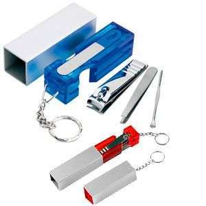 Set de Manicure con Llavero, en tubito rectangular plateado.