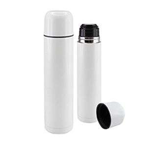 Termo blanco hecho de acero inoxidable. capacidad de 1 litro y tapa con dosificador.