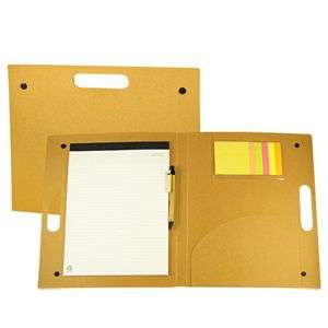Carpeta Ecológica tipo Maletín, en cartulina reciclada, con broches. Incluye Block Lineado A4 20 hojas, 1 taco post-it de 25 hojas de 7,6 x 7,6 cm + 5 tacos de 25 banderitas post-it de 7,6 x 1,5 cm., bolsillo interior y 1 bolígrafo ecológico.