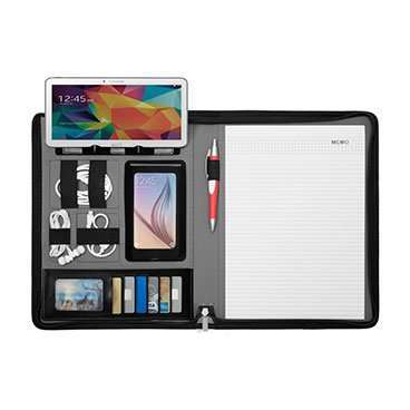Tamaño: 33,5 x 26,5 x 3 cm. (cerrada). Símil cuero. Bolsillo en la parte exterior. En la parte interna cuenta con sobre para guardar tablet, soporte con velcro para tablet o celular. Porta celular, compartimento para tarjetas o documentos y tres compartimentos para guardar cables y audífono. Porta Bolígrafo.