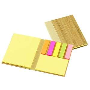 Memo Set con Tapas Duras enchapadas en madera de Bamboo. Incluye 50 post-it amarillos grandes, 25 post-it amarillos medianos y 125 banderitas adhesivas de colores.