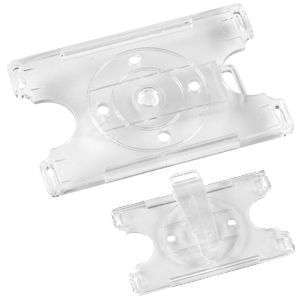 Porta-Credencial de Acrílico, para Credenciales tamaño Tarjeta de Crédito. Visibilidad por un solo lado. Con clip giratorio posterior de doble función, para presentación vertical u horizontal.