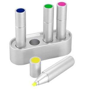 Set de 4 destacadores de color, sobre base plástica plateada. Presentación en caja de cartón color plata.